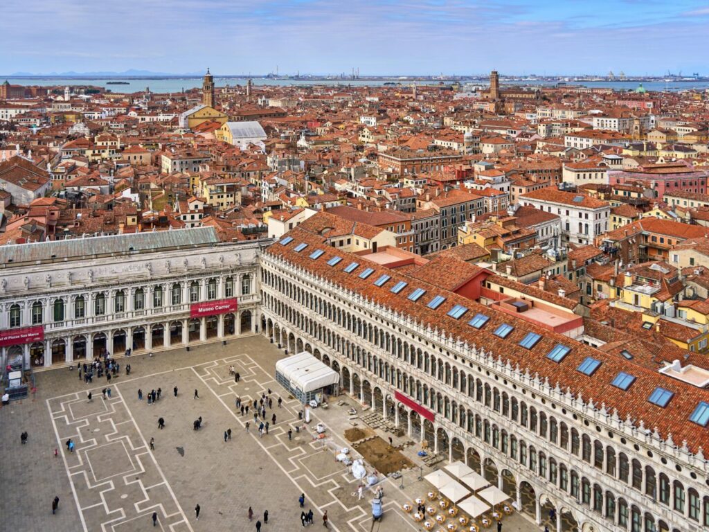 Du solltest den Platz unbedingt besuchen und die Sehenswürdigkeiten in der Nähe abklappern. Du hast vom Markusplatz aus einen tollen Blick auf die Vorderseite des Markusdoms und auf den Markusturm.